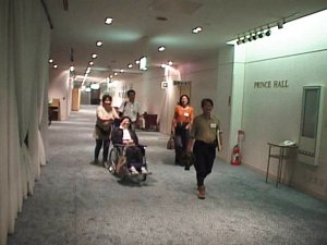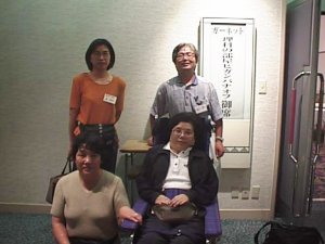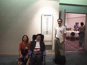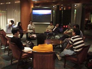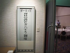 | 少し早めにホテルに入り、話がはずむ | オフ会場入り口にはなんとりっぱなプレートが |
