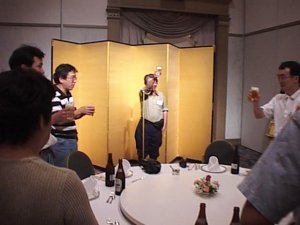 | まずは ( ^_^)/□☆□\(^_^ )カンパ-イ! | 遠路 駆けつけ一杯の宮内さん |