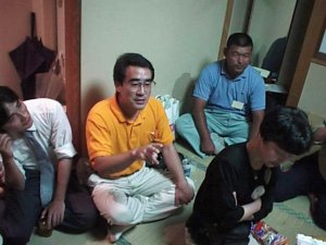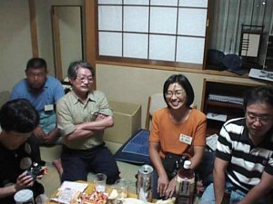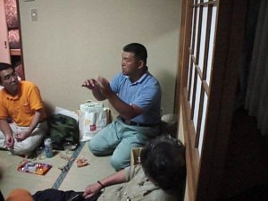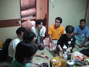 | 部屋に帰ってからも語り合い続く 荻野さん | ワイワイとエンドレスのなかモリさんも楽しそう |