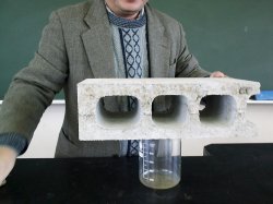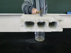 それだけで「げー、そんなことしても、かまへんの」なんて言葉が飛び出したら、半分、成功したようなものである。次にハンマーとり出して、ブロックの上から、軽くたたくようなそぶりを見せる。きっと、なんということをすると、騒ぎはじめるだろう。そこで「前の方の席のひと、少し後ろによって・・・」と言ったあと、実験の説明をする。「今から、このハンマーで、このブロックをたたいてみる。ビーカーはどうなるでしょう」と。