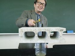 「そりゃ、こわれる!!「めげる!!」を聞いたあと「この、ビーカーに念力をかけてみると・・・」となんてやりながら、軽くハンマーで軽くブロックをたたいてみる。次にだんだんと強よくたたいてみる。きっと「どうして」と生徒たちは驚くにちがいない。