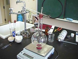 次は、スチールウールを丸底フラスコのゴム栓をしたまま燃焼させる装置で