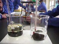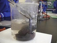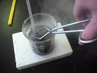 3.高温になったようなナットからるつぼばさみではさみ水の中にいれていく。1個入れる度に水をよくかきまぜて、水の温度をはかり記録していく。ジュジューという音とともに水温は上がっていく。このときに高温の物体(ナット)から低温の物体(水)に「熱エネルギー」が移動していっていることを確認させ、実感させたい。
